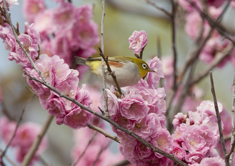 ①腹がメジロに比べ白く、脇に赤褐色斑がある